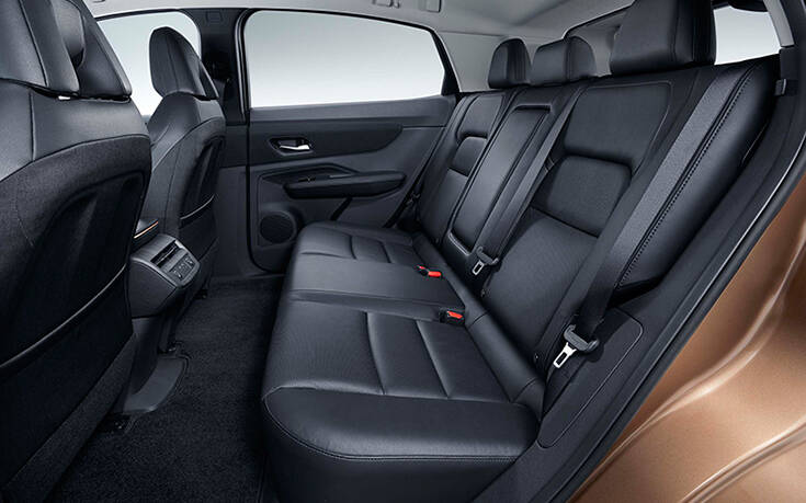 Οι επιβάτες των πίσω καθισμάτων έχουν στην διάθεσή τους αφθονία χώρων για το κεφάλι και τα πόδια, χάρη στο επίπεδο πάτωμα της καμπίνας που τους επιτρέπει να κάθονται εύκολα (ακόμα και σταυροπόδι) και να χαλαρώνουν. Τα λεπτά μπροστινά καθίσματα είναι τοποθετημένα έτσι ώστε να αποκρύπτουν την κολόνα Β, προσφέροντας στους επιβάτες μια πανοραμική θέα προς τα έξω. Το Ariya είναι επίσης εξοπλισμένο με ηλιοροφή που με το άνοιγμά της, προσφέρει ακόμα πιο έντονα συναισθήματα.