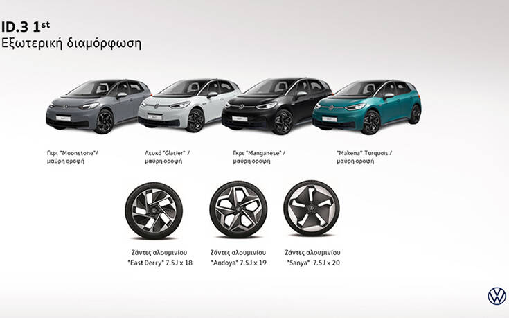 Το ID.3 1ST Edition είναι διαθέσιμο σε 3 διαφορετικές εκδόσεις εξοπλισμού, τις ID.3 1ST, ID.3 1ST Plus και ID.3 1ST Max, με δυνατότητα επιλογής ανάμεσα σε τέσσερα εξωτερικά χρώματα, τα γκρι Moonstone και Manganese, το λευκό Glacier και το χαρακτηριστικό, πανέμορφο τυρκουάζ Makena.