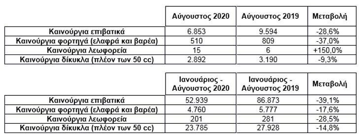 Έτσι και με βάση τα πρωτογενή στοιχεία της ΕΛΣΤΑΤ και την επεξεργασία του ΣΕΑΑ, οι ταξινομήσεις καινούργιων οχημάτων τον περασμένο Αύγουστο παρουσιάστηκαν μειωμένες σε σχέση με το 2019, εκτός από την κατηγορία των λεωφορείων, όπου όμως οι αριθμοί είναι ελάχιστοι.