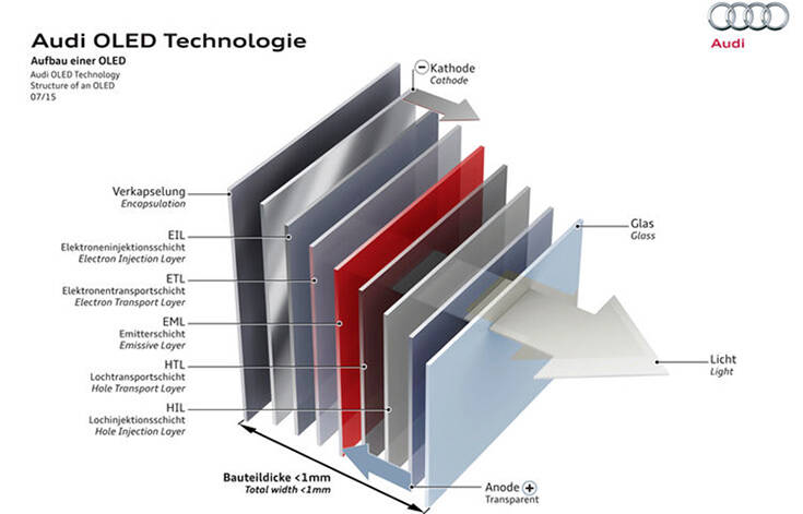 Η τεχνολογία OLED της Audi έκανε το ντεμπούτο της στα πίσω φώτα του TTRS, το 2016. Μέχρι τώρα, τα μοντέλα της μάρκας που χρησιμοποιούν τεχνολογία φωτισμού OLED είχαν έως και τέσσερα ξεχωριστά ελεγχόμενα, πολύπλοκα τμήματα φωτισμού που θα μπορούσαν να χρησιμοποιηθούν για ένα μεμονωμένο, καθορισμένο σχέδιο φωτισμού.