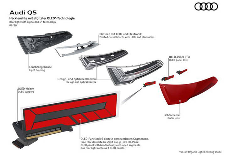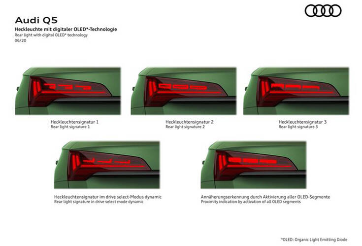 H Audi έχει υιοθετήσει τεχνολογία οργανικών διόδων εκπομπής φωτός ή organic light-emitting diodes, ευρέως γνωστές ως OLED, ήδη από το 2016 και τώρα παρουσιάζει την επόμενη γενιά, στο Q5. H ψηφιοποίηση έχει μπει πλέον σε μια νέα εποχή και η νέα τεχνολογία υπόσχεται να βελτιώσει την οδική ασφάλεια ενώ είναι η πρώτη που επιτρέπει την εξατομίκευση της «υπογραφής» των πίσω φώτων.