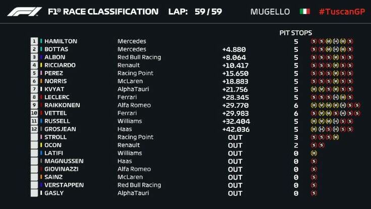 Το Γκραν Πρι της Τοσκάνης ήταν επεισοδιακό, αφού οι καραμπόλες οδήγησαν σε οκτώ αποχωρήσεις και σε τρεις διακοπές/εκκινήσεις, με τον Χάμιλτον όμως να μην επηρεάζεται από όλα αυτά.