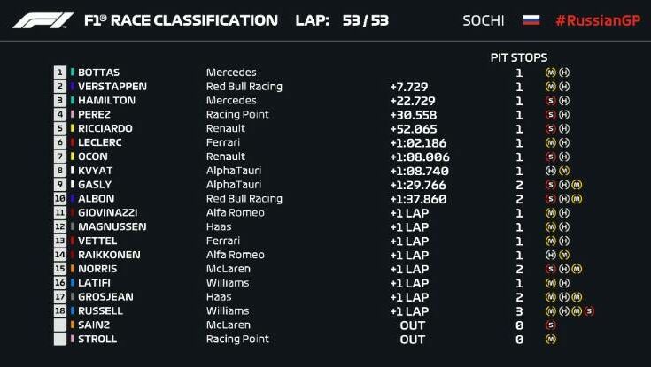 Αυτό έκανε σαφώς πιο εύκολα τα πράγματα για τον Μπότας, ο οποίος κρατούσε πάντα πίσω του τον Φερστάπεν, ενώ ο Χάμιλτον έκανε μεγάλη προσπάθεια και κατάφερε να φτάσει ως την 3η θέση.