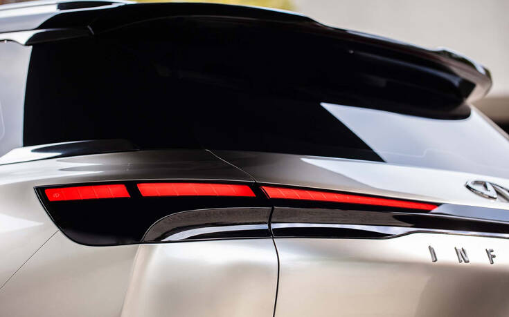 Ενσωματώνοντας με ανάγλυφα γράμματα το όνομα της εταιρίας, το QX60 Monograph διαθέτει μεγάλες ζάντες αλουμινίου που γεμίζουν τα επιβλητικά φτερά και ενισχύουν την αισθητική που εμπνέεται από τις επιδόσεις. Στο πίσω μέρος, το φαρδύ αμάξωμα και το μετατρόχιο, σε συνδυασμό με την οριζόντια σχεδιαστική γραμμή στο παράθυρο, δίνουν αίσθηση ηρεμίας και σταθερότητας. Η μαύρη οροφή δημιουργεί έντονη αντίθεση με το χρώμα του αμαξώματος, ενώ κολώνες, οροφή, τα εμπρός, πλάι και πίσω κρύσταλλα, συνδέονται αρμονικά δίνοντας πανοραμική και ευρύχωρη αίσθηση στην καμπίνα.