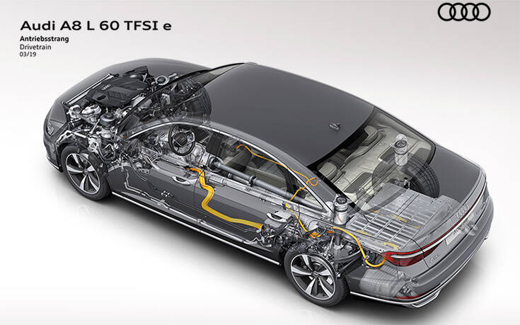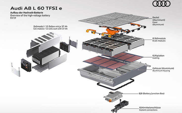 Το ρεύμα τροφοδοσίας των ηλεκτρικών κινητήρων παρέχεται από ένα σύστημα μπαταριών με υδρόψυκτες κυψέλες ιόντων λιθίου. Σε όλα τα μεσαία και μεγάλα μοντέλα, η μπαταρία 385 Volt αποθηκεύει 14,1 kWh (εξαίρεση τα 17,3 kWh στο Q7). Στα A6, A7 και A8, αποτελείται από 104 στοιχεία ενοποιημένα σε οκτώ modules.