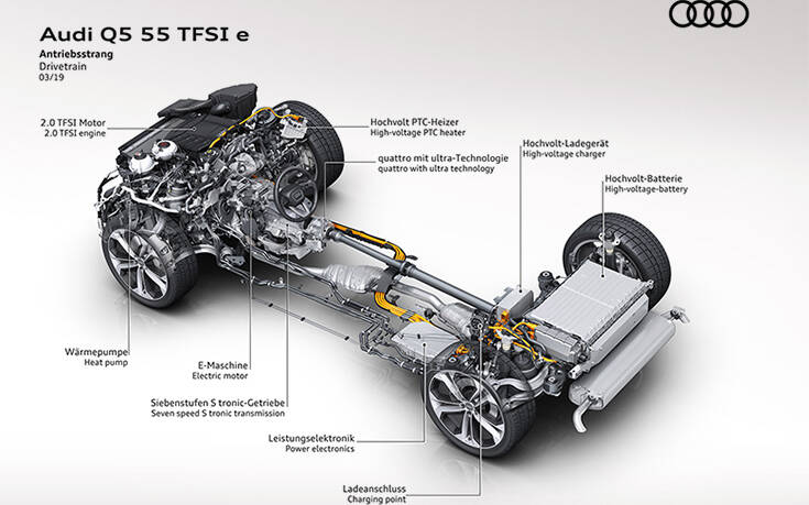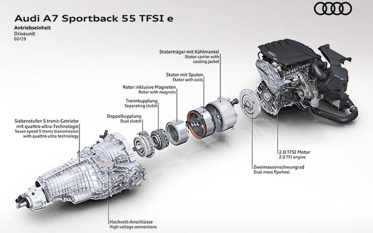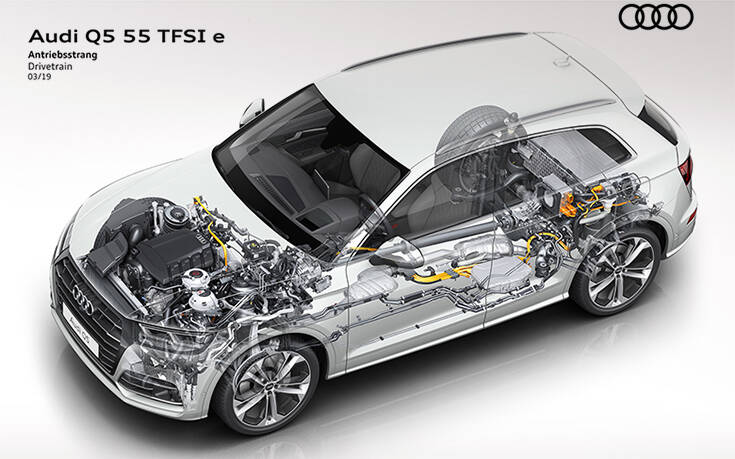 Η Audi συνδυάζει κατά περίπτωση υπερτροφοδοτούμενους κινητήρες άμεσου ψεκασμού (TFSI), είτε 3λιτρο V6 είτε 4κύλινδρο 2λιτρο, με έναν ηλεκτροκινητήρα. Σε όλα τα plug-in υβριδικά μοντέλα, ο ηλεκτροκινητήρας είναι ενσωματωμένος στο κιβώτιο ταχυτήτων. Η υβριδική μονάδα αποτελείται από τον ηλεκτροκινητήρα και έναν συμπλέκτη που συνδέει τον κινητήρα TFSI με το σύστημα μετάδοσης κίνησης. Ο συμπλέκτης βρίσκεται ακριβώς μπροστά από το κιβώτιο 7 ή 8 σχέσεων.