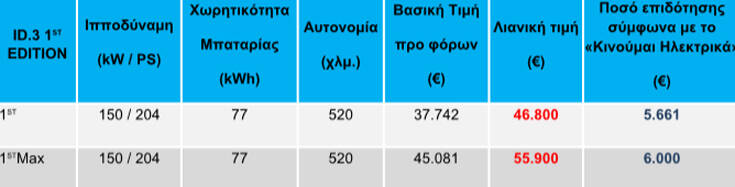 Η Kosmocar ανακοίνωσε την άμεση διαθεσιμότητα των ID.4 1STκαι ID.4 1ST Max για παραγγελία, για περιορισμένο αριθμό αυτοκινήτων, με τις προτεινόμενες τιμές λιανικής να ξεκινούν από 46.800 ευρώ. Αξίζει να σημειωθεί ότι στην τιμή αυτή δεν έχει συνυπολογιστεί το ποσό επιδότησης της καμπάνιας «Κινούμαι Ηλεκτρικά» και το οποίο φτάνει έως τα 6.000 ευρώ.