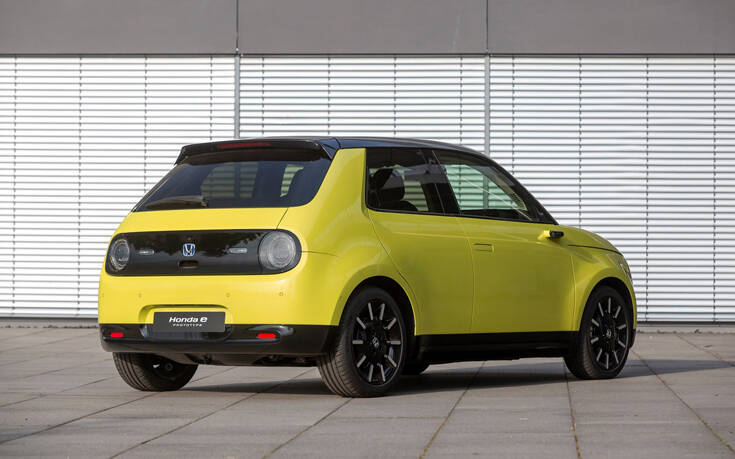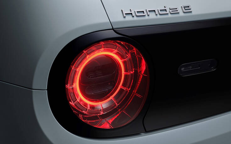Το Honda e είναι μοντέρνο και ταυτόχρονα οικείο, με ρετρό στοιχείο τα στρογγυλά φωτιστικά σώματα εμπρός. Στο κέντρο του καπό ξεχωρίζει το καπάκι (κάτω από τον οποίο βρίσκεται ο εναλλάκτης), που καλύπτει την πρίζα φόρτισης. Οι πόρτες δεν έχουν πλαίσιο και σχεδιαστικά, ξαφνιάζει η έλλειψη εξωτερικών καθρεφτών που έχουν αντικατασταθεί από κάμερες.