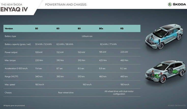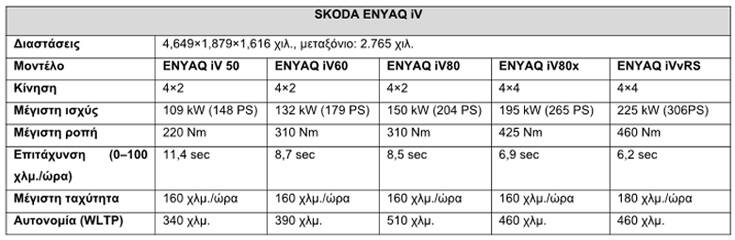 Αναλυτικά, οι εκδόσεις του Enyaq iV, με τα διαφορετικά επίπεδα ισχύος, τις διαθέσιμες μπαταρίες και τα αντίστοιχα τεχνικά χαρακτηριστικά, έχουν ως εξής: