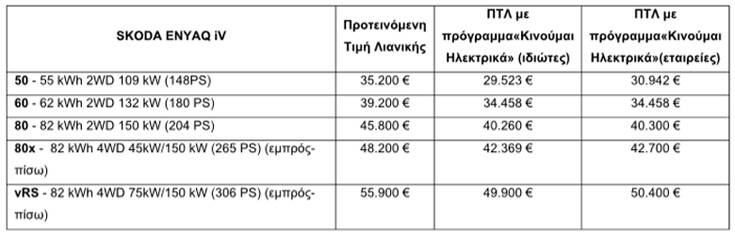 Το Enyaq iV, το πρώτο πλήρως ηλεκτρικό SUV της Skoda, είναι διαθέσιμο και στην Ελλάδα. Η Kosmocar ανακοινώνει τις ενδεικτικές προτεινόμενες τιμές λιανικής του μοντέλου, στις οποίες σίγουρα ξεχωρίζει αυτή της εισαγωγικής έκδοσης. Το Enyaq iV 50, εξοπλισμένο με κινητήρα 109 kW, πίσω κίνηση και αυτονομία έως 340 χλμ., έχει προτεινόμενη τιμή λιανικής 35.200 ευρώ, που μετά την επιδότηση του προγράμματος «Κινούμαι Ηλεκτρικά» διαμορφώνεται ουσιαστικά σε 29.523 ευρώ.