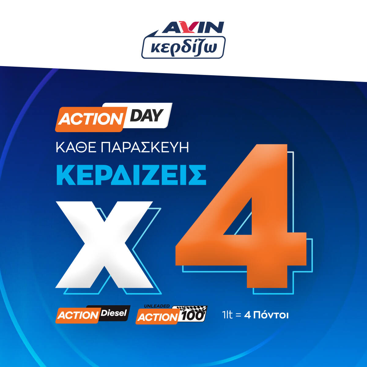 Συγκεκριμένα, κάθε Παρασκευή η ενισχυμένη αμόλυβδη ACTION 100 και το ενισχυμένο πετρέλαιο κίνησης ACTION DIESEL κερδίζουν μέσω του προγράμματος πιστότητας AVIN Κερδίζω 4 πόντους ανά λίτρο καυσίμου.