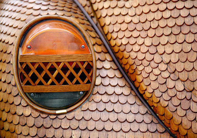 Ο ιστορικός «Σκαραβαίος» χρειάστηκε περισσότερα από 50.000 κομμάτια βελανιδιάς ώστε να καλυφθεί επιμελώς όλη του η επιφάνεια με τις ξύλινες αυτές «φολίδες»: από το σασί, τις ζάντες, τα φώτα μέχρι τους υαλοκαθαριστήρες και τους καθρέφτες. Ακόμα και το λογότυπο της VW έγινε ξύλινο!
