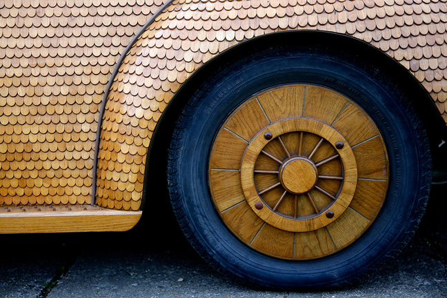 Όσο για το ομοιόμορφο ξύλινο μοτίβο του «Σκαραβαίου», αντικατοπτρίζεται ακόμα και στο ασορτί καπέλο(!) του ηλικιωμένου, ο οποίος είναι συνταξιούχος μαραγκός και φιλοτέχνησε το ξύλινο κομψοτέχνημα ως δώρο για τη σύζυγό του. Και ναι, του πήρε κάπου 2 χρόνια για να το τελειώσει.