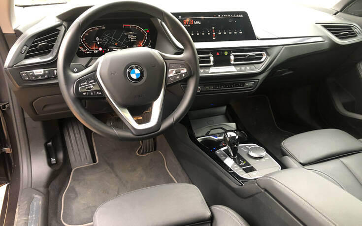 Στο οδηγοκεντρικά σχεδιασμένο εσωτερικό κυριαρχεί η εικόνα της νέας σειράς 1, με υψηλή ποιότητα υλικών – συναρμογής, προσοχή στη λεπτομέρεια και σχεδόν πλήρη εξοπλισμό σε ηλεκτρονικά συστήματα από τη βασική έκδοση. Τον χρήστη πάντως κερδίζει η άριστη θέση οδήγησης (με μικρά προβλήματα ορατότητας στις πίσω γωνίες) με τα εργονομικά όσο και άνετα καθίσματα, ο ηλεκτρονικός πίνακας οργάνων αλλά και το σύστημα iDrive τελευταίας γενιάς, το -ίσως- πιο ολοκληρωμένο και εύχρηστο της αγοράς, με την μεγάλη ευανάγνωστη και εύχρηστη (και με αφή) οθόνη.