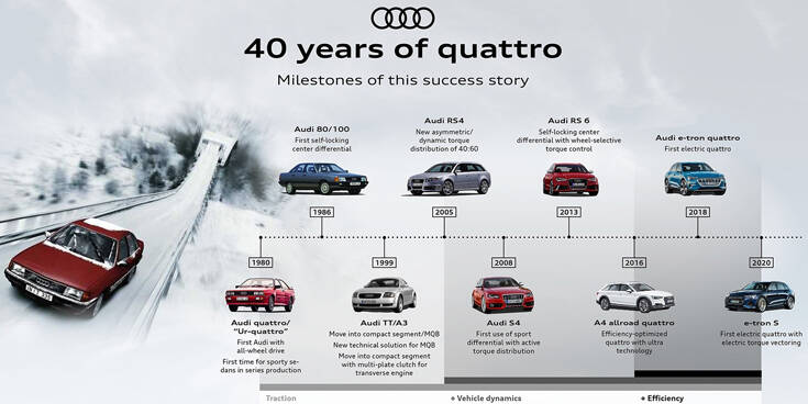 Το κινητήριο σύστημα quattro, η πιο διάσημη τετρακίνηση στην αυτοκινητοβιομηχανία, αποτελεί τον τεχνολογικό πυρήνα της Audi εδώ και 40 χρόνια. Η ιστορία επιτυχίας του quattro κυμαίνεται από τα χειροκίνητα μπλοκέ διαφορικά του 1980 έως τους τρεις ηλεκτρικούς κινητήρες των νέων μοντέλων S στη γκάμα e-tron της Audi. Ας δούμε μια συλλογή γεγονότων που εκφράζουν παραστατικά την διάσημη -πλέον- ιστορία του quattro.