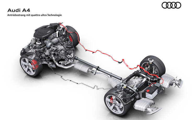 - 4 οι διαφορετικοί συμπλέκτες τετρακίνησης και άλλα τόσα τα διαφορετικά κεντρικά διαφορικά που χρησιμοποιούνται σε ολόκληρη τη γκάμα μοντέλων της μάρκας. Το αυτόματο μπλοκέ διαφορικό σχεδιάστηκε για τα μοντέλα με κινητήρα εμπρός, τοποθετημένο στον επιμήκη άξονα σε συνδυασμό με 8τάχυτο tiptronic. Σε ορισμένες εκδόσεις κινητήρα, λειτουργεί με το σπορ διαφορικό στον πίσω άξονα, το οποίο κατανέμει τη ροπή κίνησης μεταξύ των τροχών ανάλογα με την κατάσταση οδήγησης. Στα μοντέλα με κατά μήκος τοποθετημένους κινητήρες, τα 7τάχυτα Stronic συνεργάζονται με το quattro με ultra τεχνολογία, η οποία χρησιμοποιεί δύο συμπλέκτες. Στα compact μοντέλα με εγκάρσια τοποθετημένους κινητήρες, αναλαμβάνει ένας υδραυλικά ελεγχόμενος πολύδισκος συμπλέκτης, ο οποίος βρίσκεται στον πίσω άξονα για καλύτερη κατανομή βάρους. Το σπορ μοντέλο υψηλών επιδόσεων R8 διαθέτει ελεγχόμενο πολύδισκο συμπλέκτη, αλλά σε αυτή την περίπτωση είναι τοποθετημένος στον μπροστινό άξονα.