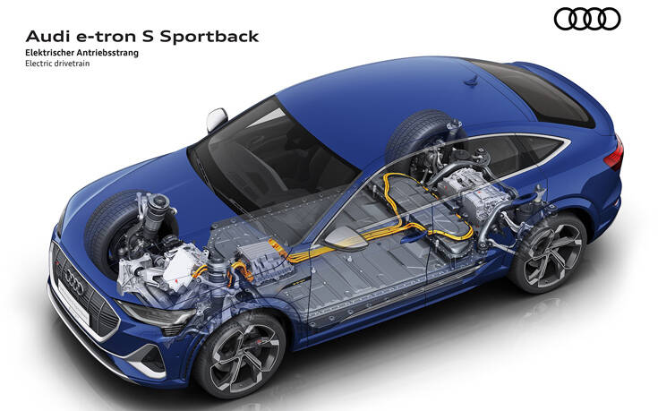 - 3 ηλεκτρικοί κινητήρες παρέχουν την ισχύ στο νέο e-tronS και το e-tron S Sportback – μια παγκόσμια πρεμιέρα σε μοντέλα μαζικής παραγωγής. Οι δύο ηλεκτρικοί κινητήρες στον πίσω άξονα καθιστούν δυνατή την ηλεκτρική κατανομή ροπής, την κατανομή της προωθητικής ισχύος σε μεμονωμένους τροχούς αριστερά και δεξιά, σύμφωνα με τις απαιτήσεις.