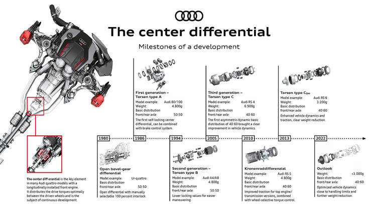 - 5 κιλά ήταν το κατά προσέγγιση βάρος του πρώτου μπλοκέ κεντρικού διαφορικού Torsen που χρησιμοποιήθηκε στο αρχικό Audi quattro, το 1986. Η βασική κατανομή ήταν 50:50 μεταξύ του εμπρός και του πίσω άξονα. Σήμερα, το μπλοκέ κεντρικό διαφορικό Torsen στα μοντέλα με διαμήκη τοποθέτηση κινητήρων ζυγίζει μόνο περίπου 3 κιλά και έχει βασική κατανομή 40% στον μπροστινό άξονα και 60% στον πίσω άξονα.