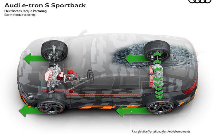 - 2.100Nm είναι κατά προσέγγιση η ροπή που παράγεται στους πίσω τροχούς στα αμιγώς ηλεκτρικά e-tron S και e-tron S Sportback, όταν στρίβουν με ταχύτητα. Καθένας από τους δύο πίσω ηλεκτρικούς κινητήρες οδηγεί έναν τροχό. Συνήθως, ο τροχός στο εξωτερικό της καμπύλης λαμβάνει σημαντικά μεγαλύτερη ροπή από τον με λιγότερο φορτίο εσωτερικό τροχό, λόγω της μεγαλύτερης πρόσφυσης του. Αυτό αυξάνει σημαντικά τη δυναμική οδήγηση και την ταχύτητα που μπορεί να στρίψει το αυτοκίνητο.
