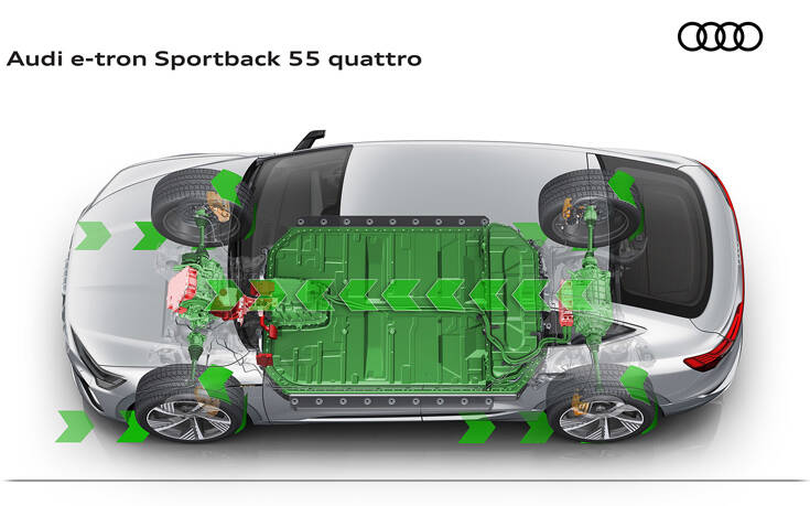 - 0 συμπλέκτες και διαφορικά λειτουργούν στα Audi e-tron και e-tron Sportback. Τα αμιγώς ηλεκτρικά SUV χρησιμοποιούν ηλεκτρική τετρακίνηση, στην οποία οι ηλεκτροκινητήρες εκτελούν όλες τις λειτουργίες quattro.