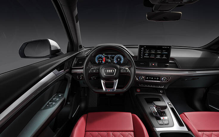 Εξωτερικά, το ανανεωμένο SQ5 TDI διαθέτει εντυπωσιακές λεπτομέρειες που του δίνουν μια ακόμα πιο στιβαρή εμφάνιση. Τα κάθετα πτερύγια διευκολύνουν τις μεγάλες πλευρικές εισόδους αέρα στους μπροστινούς προφυλακτήρες. Εμπρός, κυριαρχεί η οκταγωνική μάσκα Singleframe ειδικά για τα μοντέλα S, με μεγάλα οκταγωνικά μοτίβα κηρήθρας που συνδέονται με στενές ράβδους.