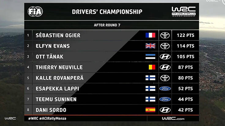 Πρωταθλητές … ατυχίας οι Βρετανοί Έβανς – Μάρτιν που προηγούνταν με 14 βαθμούς στο πρωτάθλημα οδηγών, αλλά σε ένα δύσκολο πέρασμα μιας χιονισμένης διαδρομής, έκαναν το λάθος, έβγαλαν από τον δρόμο το Yaris WRC και έμειναν με το «κύπελλο ήθους», καθώς στην συνέχεια προειδοποιούσαν τους άλλους οδηγούς (μαζί και τον Οζιέ – βασικό τους αντίπαλο) ώστε να μην πέσουν στην γλιστερή παγίδα που έπεσαν αυτοί.