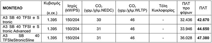 Στον πίνακα που ακολουθεί παρουσιάζονται τα οικονομοτεχνικά στοιχεία του A3 Sportback 40 TFSI e. Όσον αφορά στο A3 Sportback 45 TFSI e, θα διατίθεται κατόπιν ειδικής παραγγελίας.