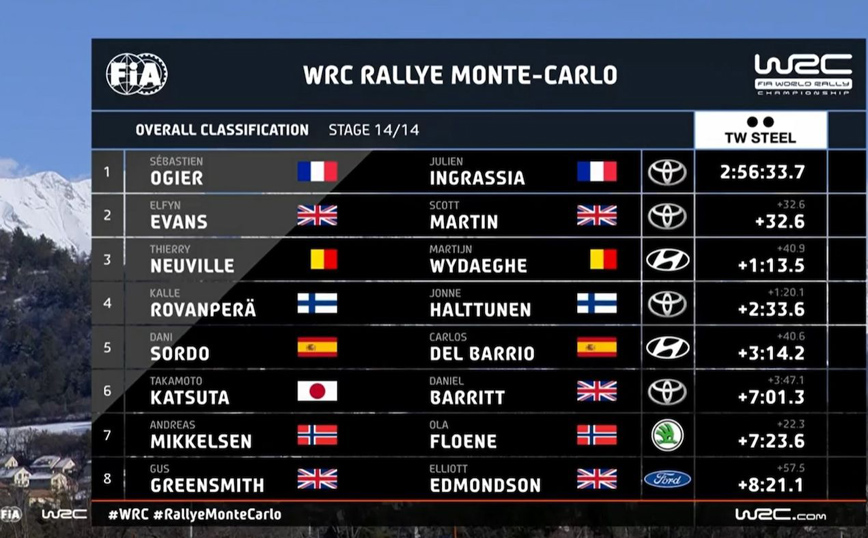 Σε ένα τέτοιο περιβάλλον, φυσικό ήταν να επικρατήσει η ικανότητα και εμπειρία των επτάκις πρωταθλητών Οζιέ – Ινγκράσια, οι οποίοι (παρά τις όποιες δυσκολίες με κλαταρισμένα λάστιχα) κέρδισαν 8 από τις διαδρομές ταχύτητας του αγώνα και την 8η νίκη τους (με 5 διαφορετικά αυτοκίνητα) στο Μόντε Κάρλο, σχετικά εύκολα. Επιπλέον πρόσθεσαν και ένα λιθαράκι στην διεκδίκηση του φετινού τίτλου κερδίζοντας και την τελευταία διαδρομή με τους έξτρα βαθμούς.