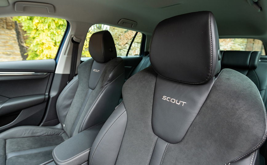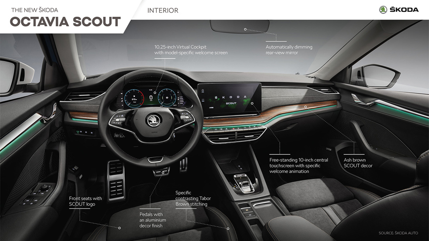 Το ευρύχωρο εσωτερικό, διαθέτει κάποιες αποκλειστικές λεπτομέρειες που της εξασφαλίζουν το δικό της, ιδιαίτερο στυλ. Σε αυτές περιλαμβάνονται διακοσμητικές λωρίδες στο ταμπλό (στάνταρ στο στυλ ξύλου στο χρώμα της τέφρας ή προαιρετικά με ασημί φινίρισμα), επενδύσεις καθισμάτων Thermo Flux και λογότυπα SCOUT στα εμπρός καθίσματα. Το πολυλειτουργικό διάκτινο δερμάτινο τιμόνι διαθέτει paddles αλλαγής ταχυτήτων. Τα πεντάλ έχουν φινίρισμα αλουμινίου, ενώ οι λεπτομέρειες στην κεντρική κονσόλα εξασφαλίζουν την επιπλέον οπτική διαφοροποίηση, σε συνδυασμό με άλλες διακοσμητικές πινελιές και καινούργια, μαλακά υλικά που ολοκληρώνουν την αίσθηση υψηλής ποιότητας του αυτοκινήτου.