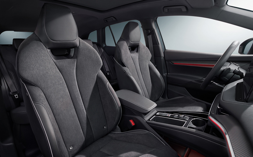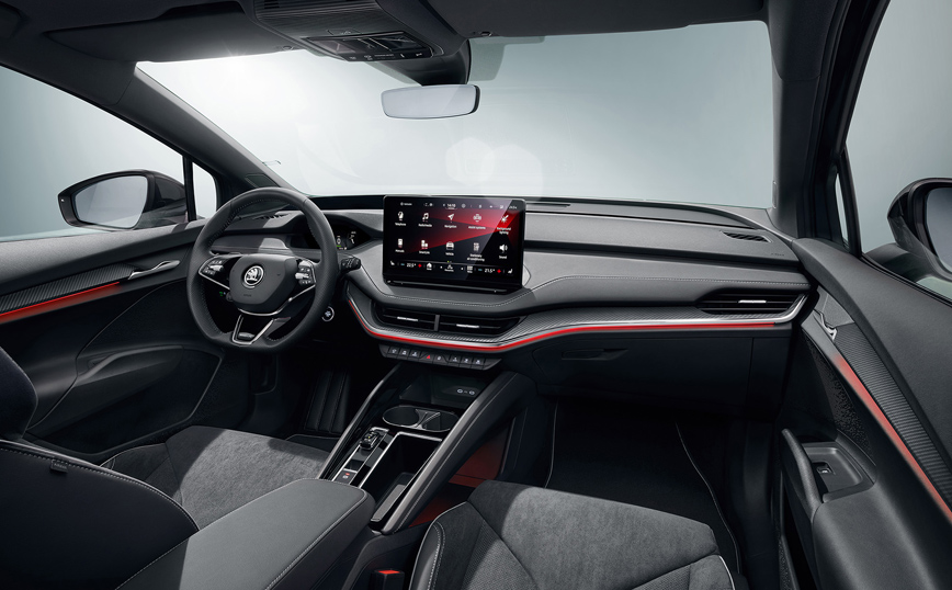 Οι σχεδιαστές εσωτερικών χώρων δημιούργησαν μια συγκεκριμένη επιλογή σχεδίασης για το σπορ Enyaq. Η ταπετσαρία και η επένδυση της οροφής είναι κυρίως μαύρες. Το ταμπλό έχει επένδυση από μαύρο συνθετικό δέρμα με γκρι αντιθέσεις και carbon λεπτομέρειες, οι οποίες κοσμούν και τις πόρτες ενώ στο ίδιο πνεύμα είναι σχεδιασμένα και τα πατάκια.