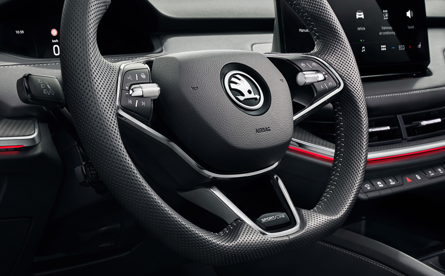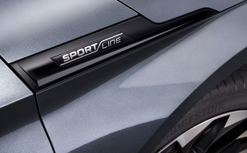 Οι στιβαρές πλευρικές ποδιές είναι βαμμένες στο χρώμα του αμαξώματος, ενώ η μπροστινή ποδιά είναι σχεδιασμένη ειδικά για αυτήν την έκδοση και τα μπροστινά φτερά φέρουν τα διακριτικά Sportline. Την σπορ εμφάνιση ενισχύουν γυαλιστερές ζάντες αλουμινίου 20 ιντσών Vega ή 21 ιντσών Betria.