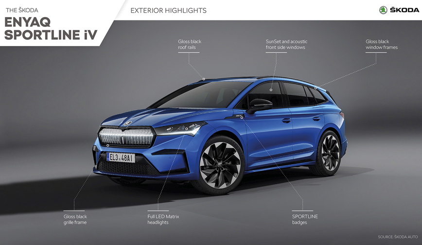 Πριν ακόμα κυκλοφορήσει στους ευρωπαϊκούς δρόμους, η Skoda εμπλουτίζει τη γκάμα του Enyaq iV, του πρώτου της αμιγώς ηλεκτρικού SUV, με μία δυναμική έκδοση, το Enyaq Sportline iV, ένα μοντέλο με έντονο σπορ χαρακτήρα, που ξεχωρίζει από τις υπόλοιπες εκδόσεις χάρη στις ιδιαίτερες σχεδιαστικές πινελιές.