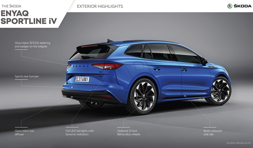 Το Enyaq Sportline iV θα κατασκευάζεται στο ίδιο εργοστάσιο της μάρκας που παράγει και τα απλά Enyaq iV. Πρόκειται για την μόνη γκάμα μοντέλων στην Ευρώπη που βασίζεται στην πλατφόρμα MEB του VW Group, που κατασκευάζεται εκτός Γερμανίας. Το μοντέλο διατίθεται σε τρεις εκδόσεις κινητήρα. Τόσο το Enyaq iV 60 με ισχύ 180 ίππων και μέγιστη ροπή 310 Nm όσο και το iV 80 με μπαταρία 82 kWh, ισχύ 204 ίππων και αυτονομία πάνω από 520 χλμ. (WLTP), διαθέτουν πίσω κίνηση.