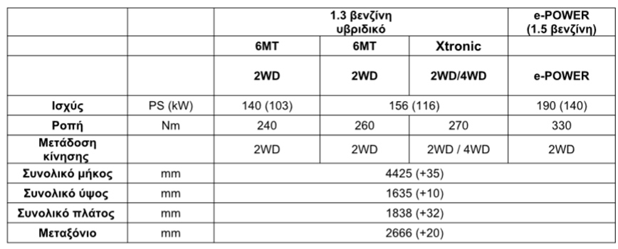 Το υβριδικό κινητήριο σύνολο 1.3 βενζίνης 12V θα προσφέρεται σε δύο επίπεδα ισχύος 140 και 158 ίππων, είτε με χειροκίνητο κιβώτιο 6 ταχυτήτων, ή με το νέο κιβώτιο ταχυτήτων Xtronic CVT (αποκλειστικά στην έκδοση 158 ίππων). Η μέγιστη ισχύς του κινητήρα έρχεται στις 5500 στροφές, με μέγιστη διαθέσιμη ροπή 270Nm στις 1750 στροφές για την έκδοση των 158 ίππων. Στις χειροκίνητες εκδόσεις, το κιβώτιο ταχυτήτων έχει βελτιωθεί για πιο γρήγορη, άμεση και σπορ αίσθηση αλλαγής ταχυτήτων. Το νέας γενιάς Xtronic CVT προσφέρει καλύτερη οικονομία καυσίμου αλλά και αίσθηση επιτάχυνσης, χάρη σε βελτιώσεις που συμπεριλαμβάνουν ένα νέο σύστημα διπλής αντλίας λαδιού.