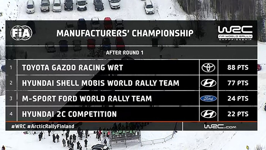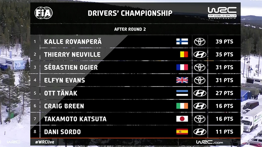Συγκεκριμένα στους οδηγούς προηγείται με 39 βαθμούς ο 21χρονος Ροβάνπερα, ακολουθούμενος από τους Νεβίλ (35β.) και Οζιέ – Έβανς (31 β.), ενώ στους κατασκευαστές η Toyota έχει 88 β., η Hyundai 77 β. και η M-Sport Ford μόλις 24 β.