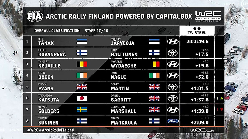 Στο περιβάλλον αυτό, ο Τάνακ, αφού πήρε από την αρχή κεφάλι, κέρδισε τις μισές ειδικές και τον αγώνα, μπαίνοντας και πάλι στην μάχη διεκδίκησης του φετινού τίτλου, καθώς το ένα από τα μεγάλα φαβορί, οι Γάλλοι Οζιέ – Ινγκρασιά (Toyota Yaris WRC), αφού ταλαιπωρούνταν στις πίσω θέσεις της κατάταξης, έκαναν ένα από τα σπάνια λάθη τους, κόλλησαν στο χιόνι και έφυγαν από το Ροβανιέμι με μόλις 1 βαθμό από την 5η θέση στην Power Stage.