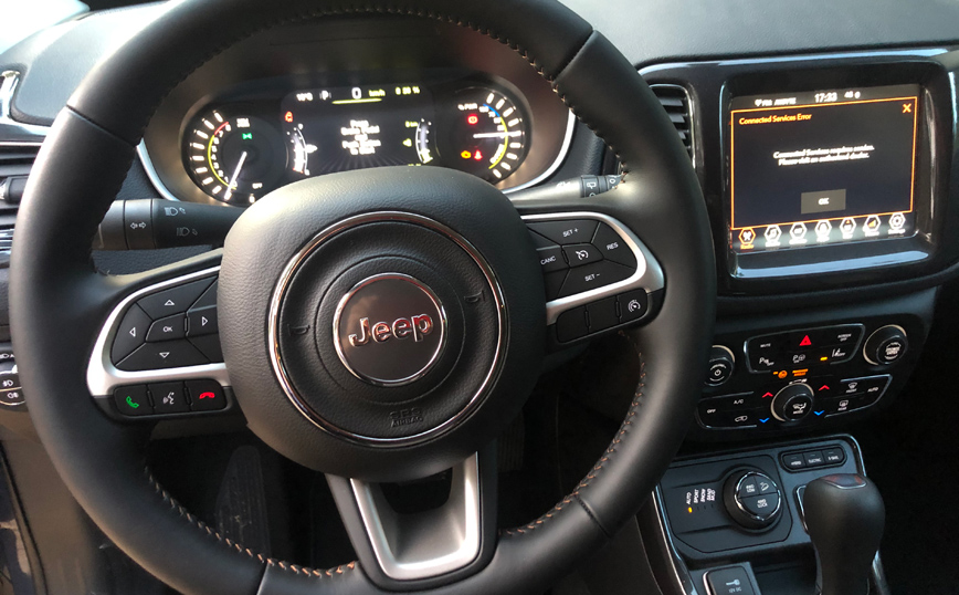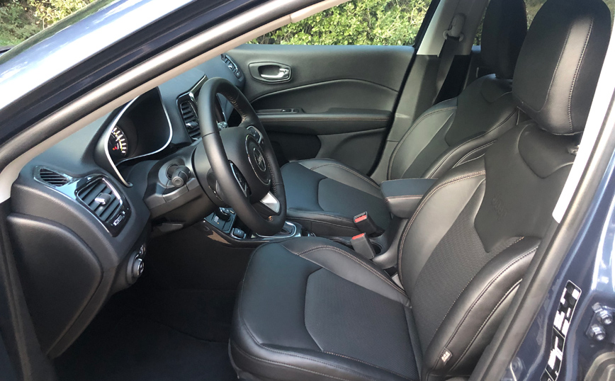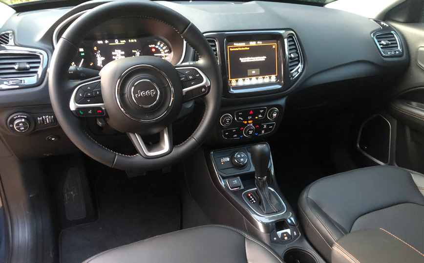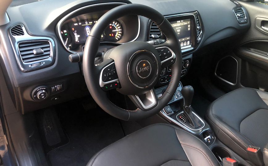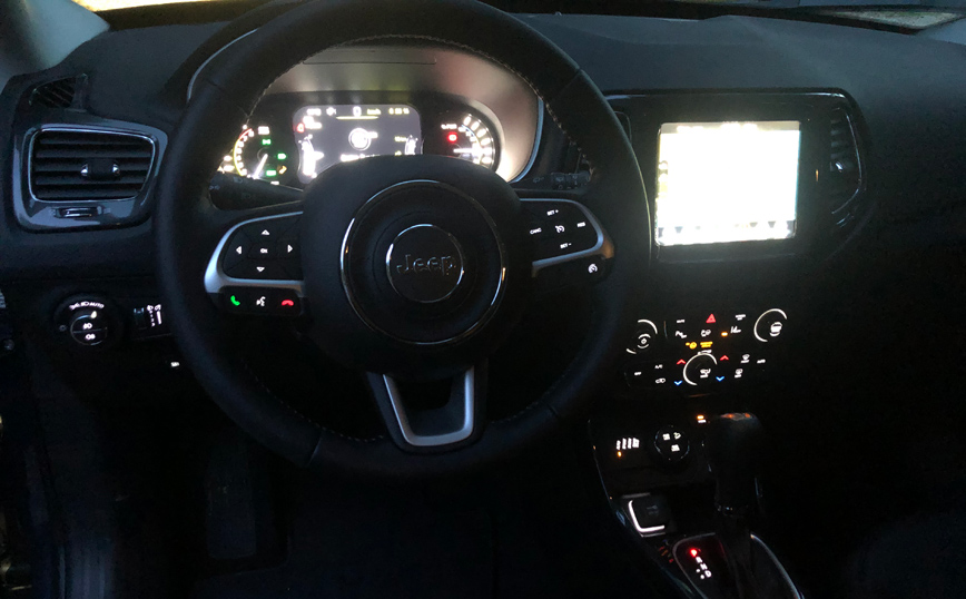 Στην ψηλή και πανοραμική θέση οδήγησης του Compass αισθάνεσαι «άρχοντας» καθώς γύρω σου είναι ένα ευχάριστο, ποιοτικό και λειτουργικό εσωτερικό, με ακριβά καλά συναρμολογημένα υλικά και πολλά καντάρια τεχνολογίας. Η εργονομία δεν παρουσιάζει δυσκολίες, όπως επίσης και η περιφερειακή ορατότητα, με εξαίρεση το μικρό πίσω παμπρίζ και τις φαρδιές πίσω κολώνες, ατέλειες που «διορθώνει» η κάμερα οπισθοπορείας.