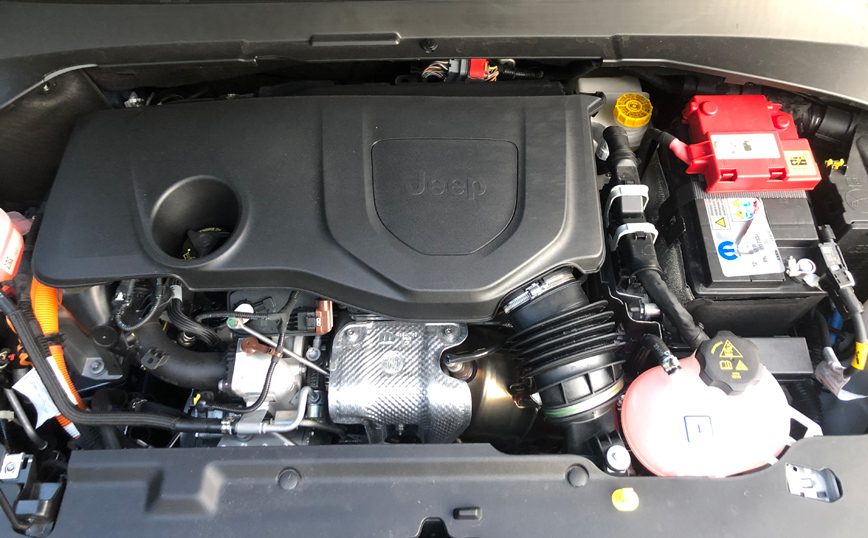 Το υβριδικό σύστημα της έκδοσης του Compass (όπως άλλωστε και του Renegade) περιλαμβάνει έναν τούρμπο κινητήρα βενζίνης 1.300 κ.εκ., ισχύος 130 ίππων και δυο ηλεκτροκινητήρες. Ο θερμικός κινητήρας είναι κατασκευασμένος από αλουμίνιο, ζυγίζει μόνο 106 κιλά. και έχει ενσωματωμένο στον ιμάντα ψύξης ένα μικρό ηλεκτροκινητήρα που προσθέτει στην απόδοση και ταυτόχρονα μειώνει την κατανάλωση.