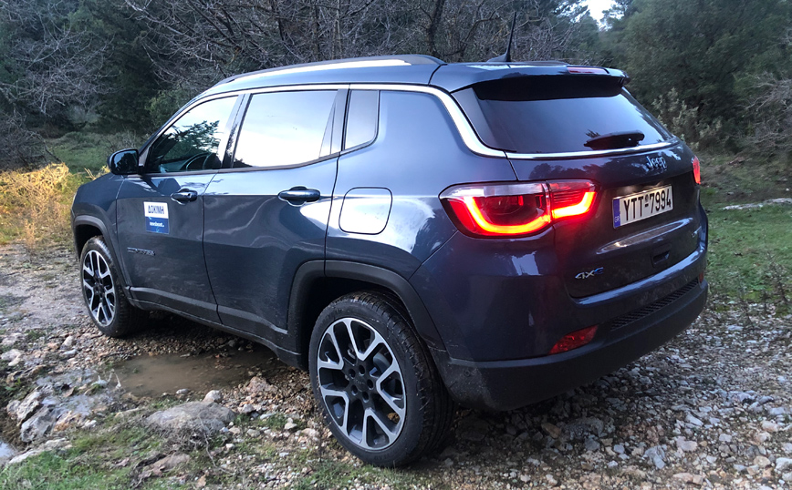 Όσο πολιτισμένο και άνετο είναι το Compass, τόσο ικανό και ακόμα περισσότερο (με τα κατάλληλα λάστιχα) γίνεται στις εκτός δρόμου μετακινήσεις, εκεί όπου η τετρακίνηση, το σύστημα Selec Terrain, οι μικροί πρόβολοι και το ύψος από το έδαφος κάνουν την διαφορά σε σχέση με τον ανταγωνισμό. Ακόμα μεγαλύτερη διαφορά, κάνει ο ηλεκτροκινητήρας που κινεί τους πίσω τροχούς, αναβαθμίζοντας τις θρυλικές εκτός δρόμου δυνατότητες των Jeep. Στην εκτός δρόμου κίνηση, ο οδηγός δεν έχει παρά να διαλέξει ποια ρύθμιση τον διευκολύνει και από εκεί και πέρα πρέπει να νοιάζεται μόνο για το που πάει ο δρόμος. Όμως, αν δεν έχει αλλάξει λάστιχα και δεν έχει προσθέσει ρεζέρβα στον εξοπλισμό, τότε χρειάζεται μεγάλη προσοχή γιατί τα 235/45/19 με την ασφάλτινη χάραξη μόνο για χώμα και περιπέτειες δεν προσφέρονται.