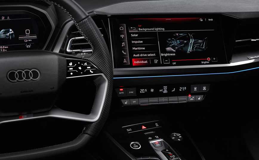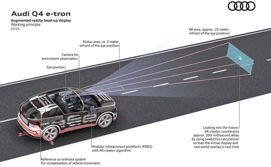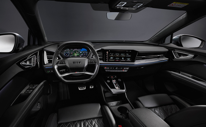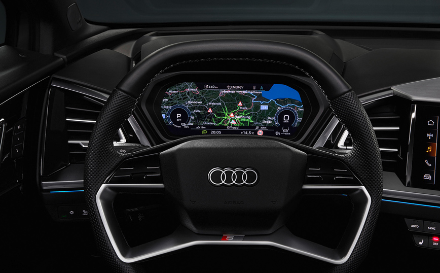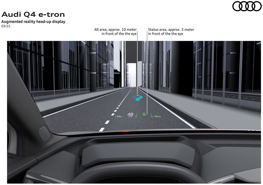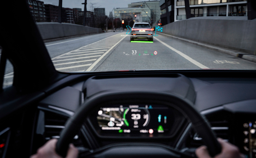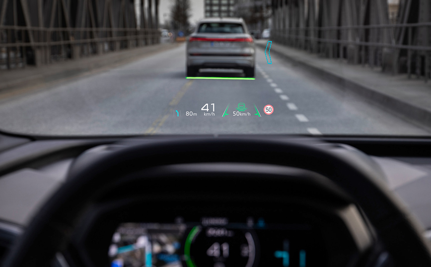Κορυφαίο ίσως χαρακτηριστικό του εσωτερικού εξοπλισμού του νέου μοντέλου, η καινοτόμα head-up οθόνη επαυξημένης πραγματικότητας, που συνταιριάζει τον πραγματικό με τον εικονικό κόσμο, με τις οδηγίες πλοήγησης να εκτείνονται στο οπτικό βάθος πεδίου του οδηγού. Αν σε αυτή προστεθεί το πρωτοποριακό concept τιμονιού με λειτουργία αφής με το οποίο είναι εξοπλισμένο το νέο Q4 e-tron, αντιλαμβάνεται εύκολα κάποιος ότι, το νέο μοντέλο αποτελεί μία πρόγευση ενός συναρπαστικού ηλεκτρικού μέλλοντος.