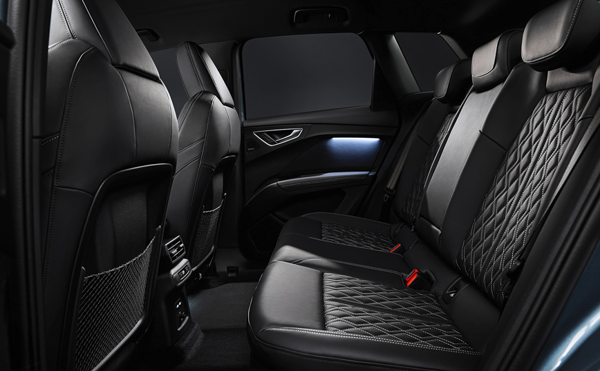 Η αρχιτεκτονική της αρθρωτής πλατφόρμας για την ηλεκτροκίνηση (MEB) στην οποία βασίζεται το Q4 e-tron, εγγυάται μεγάλη ευρυχωρία και οι αριθμοί το επιβεβαιώνουν: με μήκος 4.590 χιλιοστά, πλάτος 1.865 χιλιοστά και ύψος 1.613 χιλιοστά, το νέο ηλεκτρικό μοντέλο είναι μεν από τα μεγαλύτερα compact SUV, όμως οι εσωτερικοί χώροι, το τοποθετούν σε μεγαλύτερη κατηγορία. Με μπροστινό πρόβολο μόλις 86 εκατοστά, το 2,76 μέτρων μεταξόνιο εξασφαλίζει εσωτερικό μήκους 1,83 μέτρων, αντίστοιχο με ένα μεγάλο SUV. Οι πόρτες που ανοίγουν διάπλατα, η δεύτερη σειρά καθισμάτων τοποθετημένη σχεδόν επτά εκατοστά ψηλότερα από την μπροστινή και η απουσία κεντρικής σήραγγας, εξασφαλίζουν ότι το μοντέλο θέτει σημεία αναφοράς στην κατηγορία. Παράλληλα, ως γνήσιο SUV διαθέτει πλούσιους εσωτερικούς αποθηκευτικούς χώρους, με όγκο έως 24,8 λίτρα, ενώ -για πρώτη φορά- μπουκάλια ενός λίτρου μπορούν να αποθηκευτούν σε υποδοχές τοποθετημένες ψηλά στις πόρτες, αυξάνοντας την άνεση και την εργονομία.