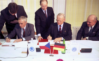 Αρχικά, 24 εταιρείες θεωρήθηκαν πιθανοί συνεργάτες, πριν από το καλοκαίρι του 1990 πραγματοποιήθηκαν συνομιλίες με οκτώ, υπό την ηγεσία του τότε πρωθυπουργού Petr Pithart. Υπεβλήθησαν τέσσερις προσφορές ενώ η τελική επιλογή έγινε ανάμεσα στη συμμαχία Renault/Volvo και το VW Group, με το τελευταίο να επικρατεί καθώς έδωσε έμφαση στη μελλοντική εξέλιξη της Skoda. Στις 28 Μαρτίου 1991, ο Jan Vrba, Υπουργός Βιομηχανίας της Τσεχικής Δημοκρατίας και ο Carl H. Hahn, ως Πρόεδρος του Διοικητικού Συμβουλίου του VW Group, υπέγραψαν συμφωνία για την ίδρυση κοινής επιχείρησης παραγωγής οχημάτων Skoda. Το VW Group έλαβε το 31% των μετοχών της Skoda Auto καταβάλλοντας 620 εκατομμύρια μάρκα. Στην συνέχεια, αύξησε σταδιακά το μερίδιό του έως το 100 % των μετοχών, στις 30 Μαΐου 2000.