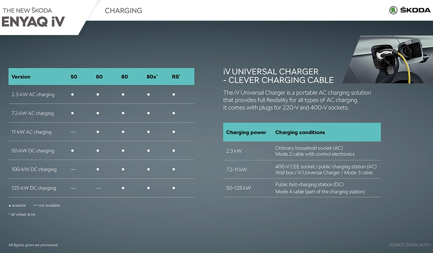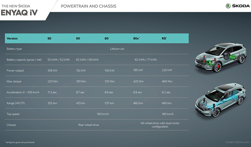 Το ENYAQ iV εκμεταλλεύεται πλήρως τις τεχνικές δυνατότητες και την ευελιξία που προσφέρει η MEB, καθώς διατίθεται με τρία μεγέθη μπαταρίας και σε πέντε διαφορετικά επίπεδα ισχύος. Τα δύο πιο ισχυρά μοντέλα διαθέτουν κίνηση σε όλους τους τροχούς χάρη σε έναν δεύτερο ηλεκτρικό κινητήρα στον μπροστινό άξονα ενώ στα υπόλοιπα η κίνηση μεταδίδεται στους πίσω τροχούς.