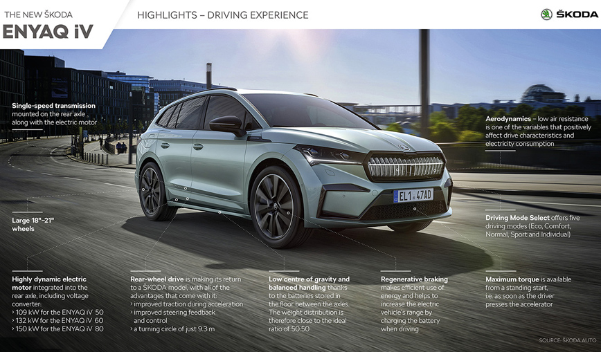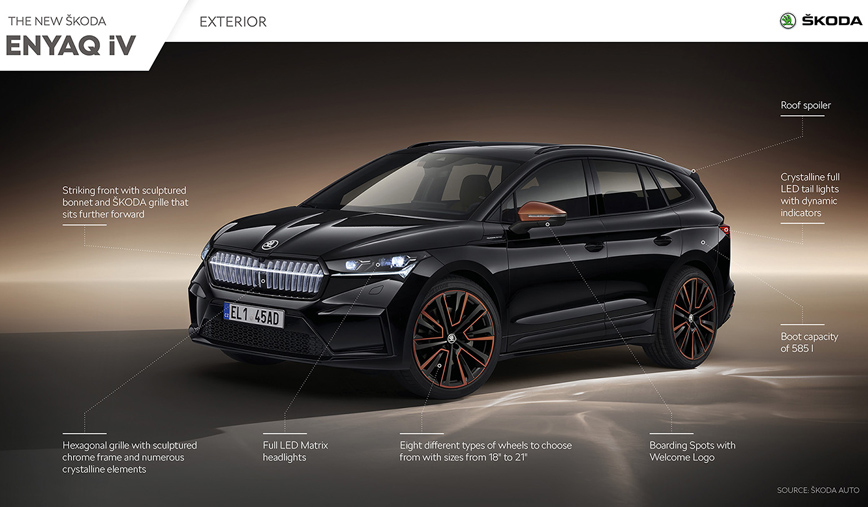 Η νέα ναυαρχίδα της Skoda διαθέτει άφθονους εσωτερικούς χώρους, όπως είναι χαρακτηριστικό της μάρκας και εντυπωσιακή εμφάνιση. Στο εσωτερικό, το νέο concept των Design Selections, οι νέες επιλογές σχεδίασης, αντικαθιστούν τα κλασικά επίπεδα επένδυσης, ενώ μια καθαρή και νέα δομή των διαθέσιμων επιλογών σημαίνει ότι το αυτοκίνητο μπορεί να διαμορφωθεί σε λίγα μόνο βήματα. Το ENYAQ iV έρχεται με κίνηση πίσω ή σε όλους τους τροχούς και υπάρχουν διαθέσιμα πέντε επίπεδα ισχύος και τρία μεγέθη μπαταρίας. Η άνω των 520 χλμ. αυτονομία (προκαταρκτική, WLTP) εγγυάται ταξείδια μεγάλων αποστάσεων.