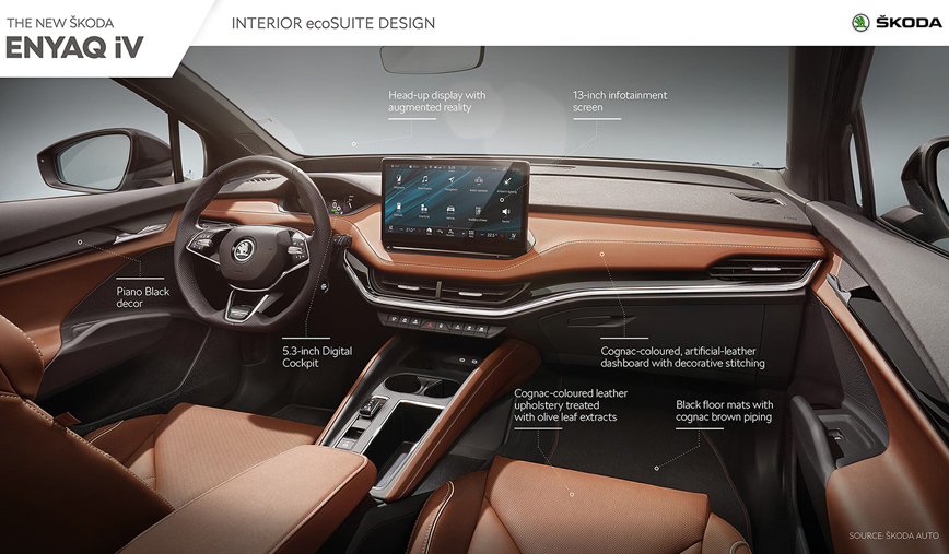 Το ENYAQ iV μπορεί να εξοπλιστεί με μια πρωτοποριακή head-up οθόνη με τεχνολογία επαυξημένης πραγματικότητας που προβάλλει πληροφορίες για τον οδηγό σε δύο διαφορετικές περιοχές. Εκτός από την τρέχουσα ταχύτητα και τα σήματα κυκλοφορίας, πληροφορίες από τα συστήματα υποβοήθησης και οδηγίες πλοήγησης μπορούν επίσης να εμφανίζονται στο παρμπρίζ ακριβώς πάνω από το ταμπλό, στην πιο κοντινή στο οδηγό ζώνη. Η μεγαλύτερη ζώνη προβολής για επαυξημένη πραγματικότητα βρίσκεται ψηλότερα στο παρμπρίζ και νοητά πιο μακριά από τον οδηγό. Εδώ, εμφανίζονται μεγαλύτερα σύμβολα, όπως βέλη κατεύθυνσης από το σύστημα πλοήγησης. Πληροφορίες σχετικά με το Adaptive Lane Assist ή το Adaptive Cruise Control εμφανίζονται επίσης εδώ, όπως και οι πινακίδες κυκλοφορίας και οι προειδοποιήσεις. Μέσω του μενού του συστήματος, το πρόγραμμα οδήγησης μπορεί να προσαρμόσει τη θέση της περιοχής προβολής στο παρμπρίζ, να ρυθμίσει χρώμα και φωτεινότητα και να επιλέξει ποιες πληροφορίες θα εμφανίζονται.