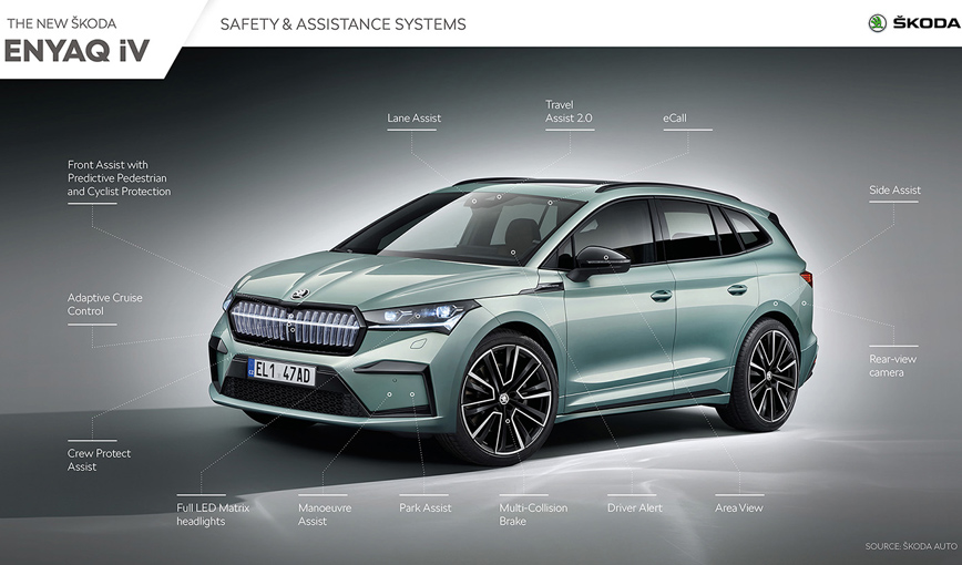 Το SKODA ENYAQ iV προσφέρει στους επιβάτες υψηλά επίπεδα ενεργητικής και παθητικής ασφάλειας. Το ηλεκτρικό SUV διαθέτει έως εννέα αερόσακους, μια ολοκληρωμένη και προληπτική λειτουργία CrewProtect Assist και πολλά προηγμένα συστήματα υποβοήθησης. Το Travel Assist με διαμήκη και πλευρική υποστήριξη είναι μόνο ένα από αυτά.