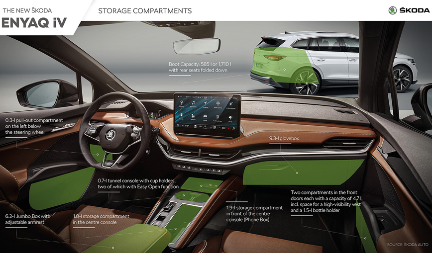 Επιπλέον, καθώς τα ηλεκτρικά οχήματα δεν διαθέτουν σήραγγα μετάδοσης, οι σχεδιαστές το εκμεταλλεύτηκαν για να δημιουργήσουν ένα νέο εσωτερικό concept για το ENYAQ iV που περιλαμβάνει έξυπνες επιλογές αποθήκευσης. Δημιούργησαν μια κεντρική κονσόλα που φιλοξενεί ένα δεύτερο διαμέρισμα αποθήκευσης χωρητικότητας 11,4 λίτρων επιπλέον του Jumbo Box 6,2 λίτρων, κάτω από το κεντρικό υποβραχιόνιο.
