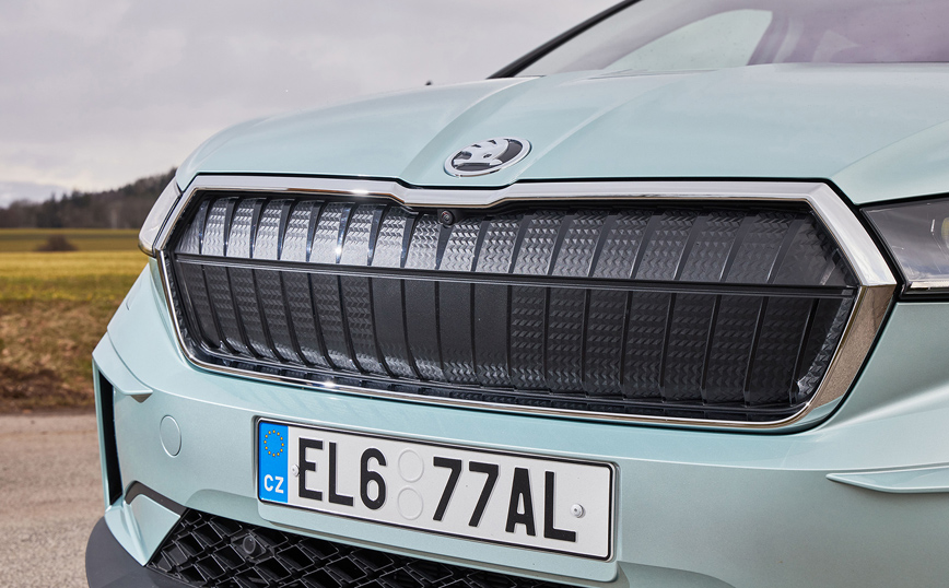 Ο σχεδιασμός χαρακτηρίζεται από ισορροπημένες αναλογίες, όντας σύγχρονος και δυναμικός. Το προαιρετικό Crystal Face, η νέα χαρακτηριστική μάσκα, εντυπωσιάζει με τις κάθετες ραβδώσεις που φωτίζονται από 131 LED, ενώ μια οριζόντια λωρίδα φωτός ολοκληρώνει την εμφάνιση του αυτοκινήτου. Μαζί με τα φώτα πορείας κατά τη διάρκεια της ημέρας και τις μονάδες LED των προβολέων Full LED Matrix για χαμηλή δέσμη και υψηλή δέσμη, η φωτισμένη γρίλια δημιουργεί μια χαρακτηριστική οπτική υπογραφή. Οι μεγάλοι τροχοί (διαμέτρου 18 έως 21 ιντσών) τονίζουν την εμφάνιση του μοντέλου. Στην έκδοση Founders Edition, το Crystal Face και οι τροχοί 21 ιντσών αποτελούν μέρος του βασικού εξοπλισμού. Αυτή η ειδική έκδοση περιορίζεται σε 1.895 μονάδες (συμβολικός φόρος τιμής στο έτος κατά το οποίο οι Václav Laurin και Václav Klement ίδρυσαν την –πάλαι ποτέ- Τσέχικη εταιρεία).