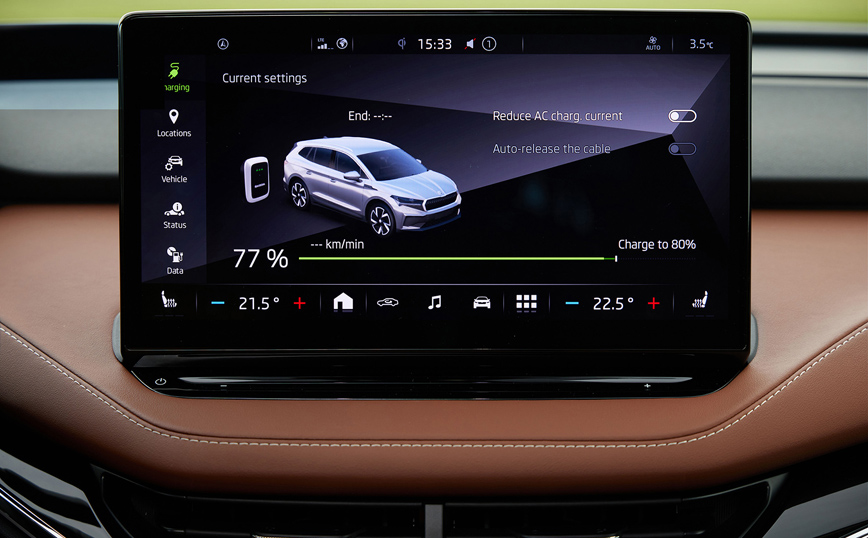 Νέες μορφές προβολής και διαδικτυακές υπηρεσίες ειδικά για τα ηλεκτρικά οχήματα ορίζουν την προηγμένη ψυχαγωγία του ηλεκτρικού μοντέλου από την τεχνολογία Modular Infotainment Matrix τελευταίας γενιάς. Το κέντρο ελέγχου είναι η κεντρική οθόνη αφής η οποία, με μέγεθος 13 ιντσών. Ο χειρισμός της γίνεται ανέπαφα, τόσο με κινήσεις των χεριών όσο και με φωνητικό έλεγχο – μέσω του ψηφιακού βοηθού φωνής Laura. Επιπλέον, το νέο μοντέλο είναι πάντα και «έξυπνα» συνδεδεμένο, ενώ η φόρτιση της μπαταρίας και ο κλιματισμός μπορούν να ελεγχθούν από απόσταση μέσω της εφαρμογής MySkoda.