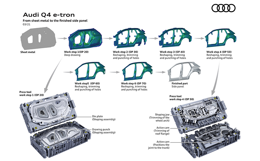 Προκειμένου να επιτευχθεί αυτό το ακριβέστατο αποτέλεσμα, η ομάδα που είναι υπεύθυνη για την κατασκευή των μηχανουργικών εργαλείων εμπλέκεται από πολύ νωρίς, στα πρώτα στάδια της ανάπτυξης και εξετάζουν προτάσεις με βάση την εμπειρία τους σχετικά με τη δυνατότητα υλοποίησης. Για το Q4 e-tron, η κατασκευή των μηχανουργικών εργαλείων μοιράστηκε στα δύο εργοστάσια της μάρκας στην Γερμανία, καθώς οι ειδικοί από το Ίνγκολσταντ ανέλαβαν τα πλαϊνό πάνελ, τις πόρτες και την οροφή, ενώ οι συνάδελφοί τους στο Νέκαρσουλμ το καπό και την πέμπτη πόρτα.